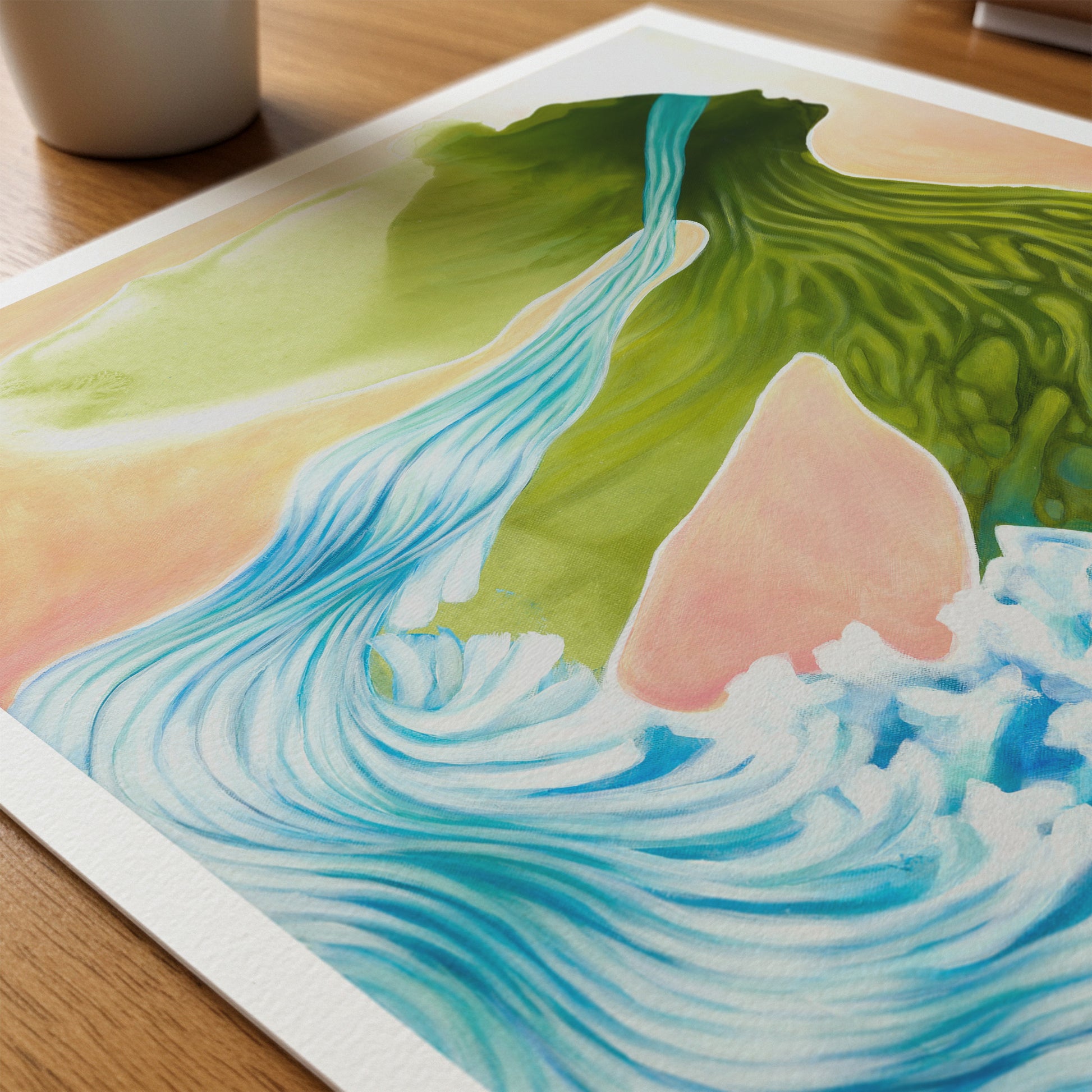 With vibrant color and elemental symbolism, this piece tells a timeless story of creation and connection. The rich greens represent growth, rootedness, and the wisdom of the body, while the flowing blues speak to emotional depth, intuition, and the sacred clarity of water. Soft corals and sun-warmed peach tones evoke vitality, tenderness, and the life-giving energy of the feminine.