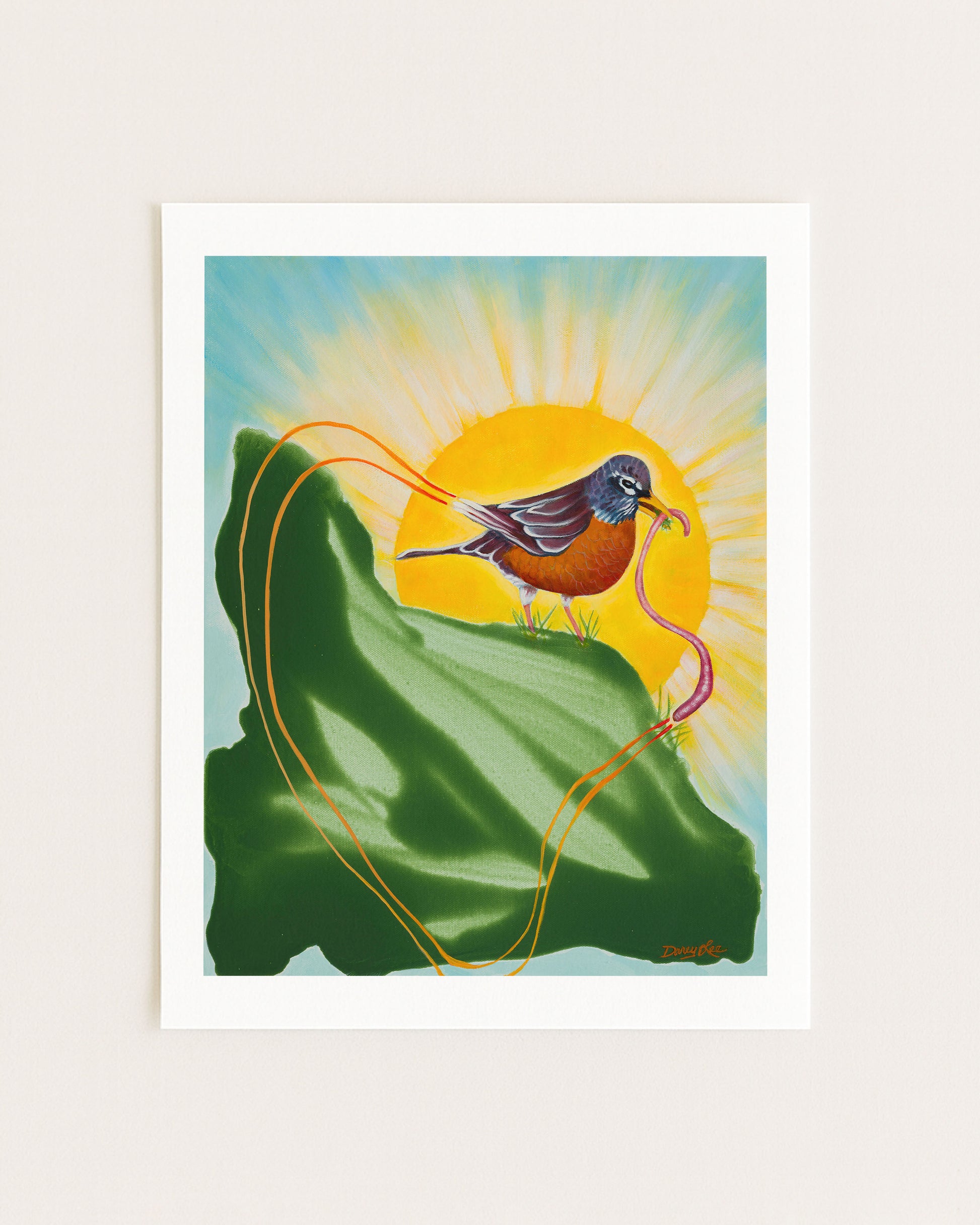 "AS ONE" – A 16×20-inch acrylic on canvas inspired by watching robins move with confidence, pulling beautiful earthworms from the seemingly chaotic grass. This is a visual meditation on the connection of all things and the quiet harmony that moves beneath apparent disorder.
