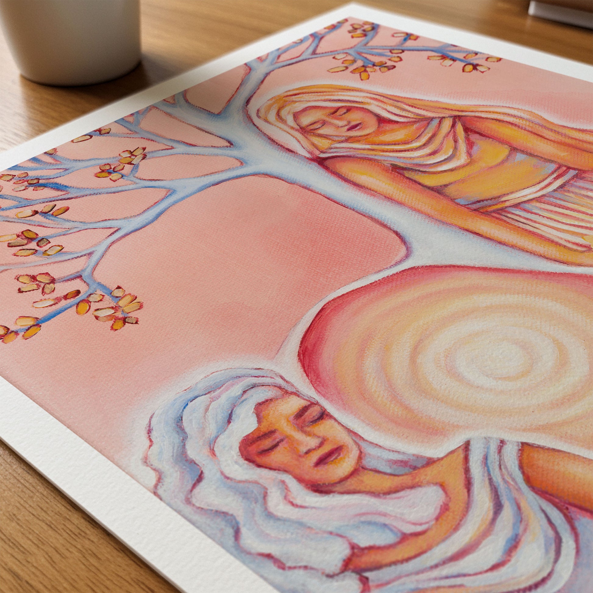This intimate piece reflects a quiet awareness of our inner treasures and the sacred threads that link us to our ancestors and spirit. Warm, vibrant hues flow together in harmony, weaving a story of openness, presence, and the beauty of belonging. Shades of coral and rose speak to love and tenderness, while deep red conveys vitality, grounding, and the sacred root of life. Soft blues offer a sense of calm and truth, and glowing honey tones shimmer with generosity and wisdom.