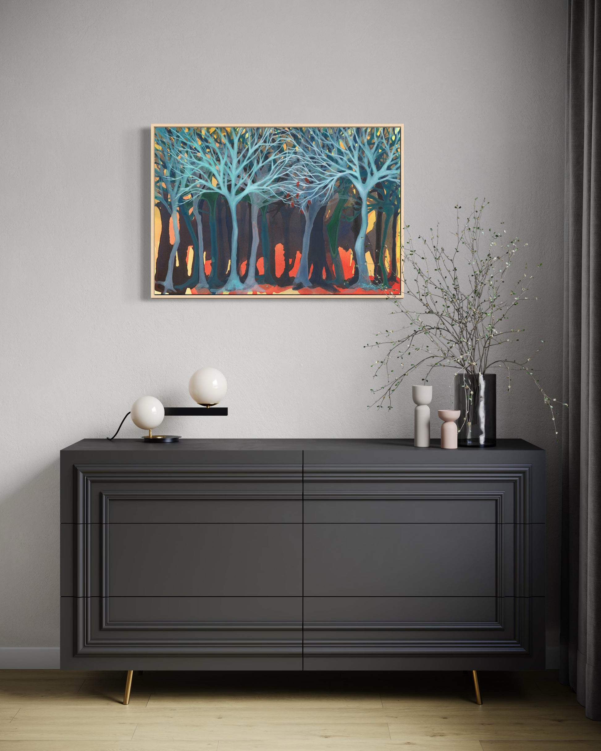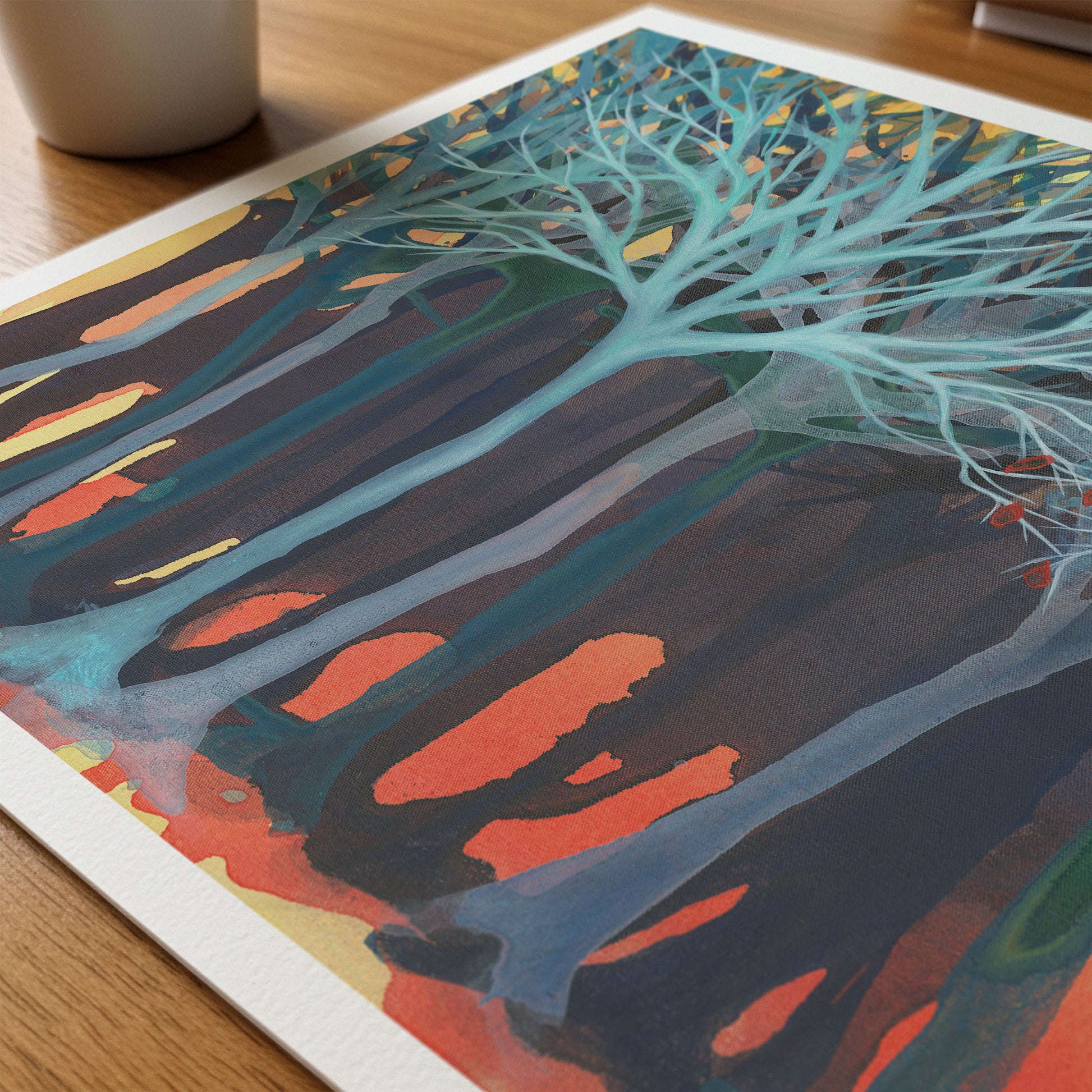 Cool blues evoke presence, peace, and emotional clarity. Deep greens bring the energy of rootedness and resilience. Golden light suggests soul vitality, while crimson and coral tones speak to life force, connection, and warmth. Flecks of red throughout the branches represent mortality and vitality through a life fully lived, symbolizing what we inherit, what we offer, and what endures.