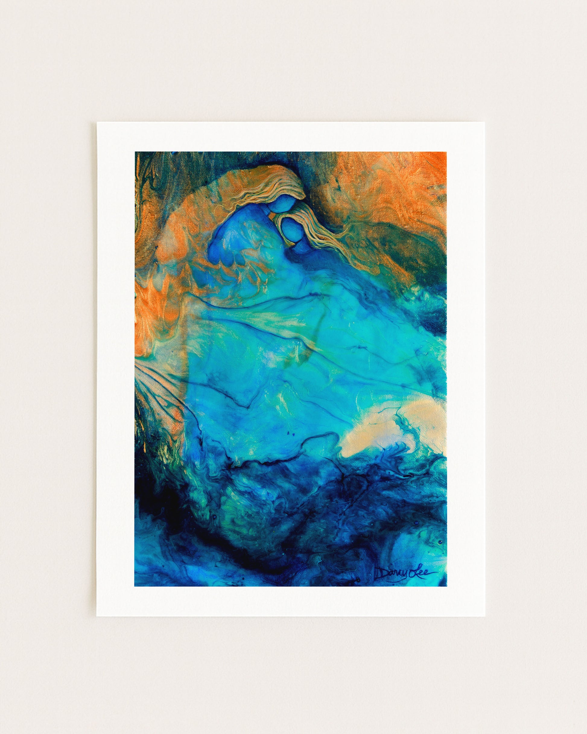 Soft blue and turquoise tones bring a sense of calm, nurturing, and emotional openness. Deep indigo swells suggest depth and devotion, while warm copper and gold tones radiate the protective warmth of love. The figures appear to dissolve into one another, echoing the way presence, affection, and connection can melt boundaries and restore the heart.