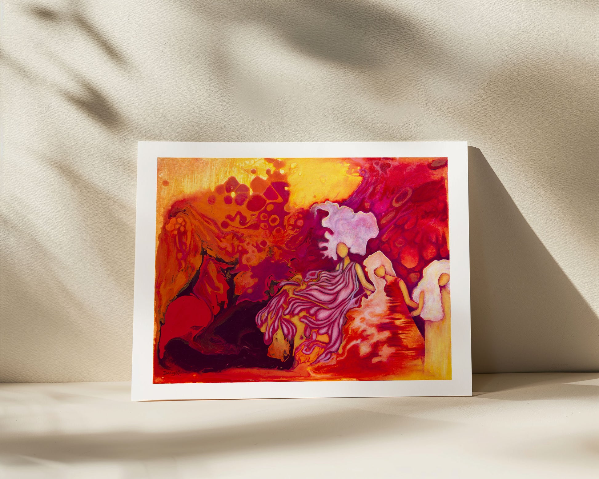 Red speaks to life-force, courage, and the raw power of creation. Orange brings energy, movement, and transformation. Gold carries divine light, illumination, and the warmth of spiritual presence. These colors together create an atmosphere of emergence and rooted knowing, echoing the rhythm of the feminine as it flows through earth, body, and spirit.