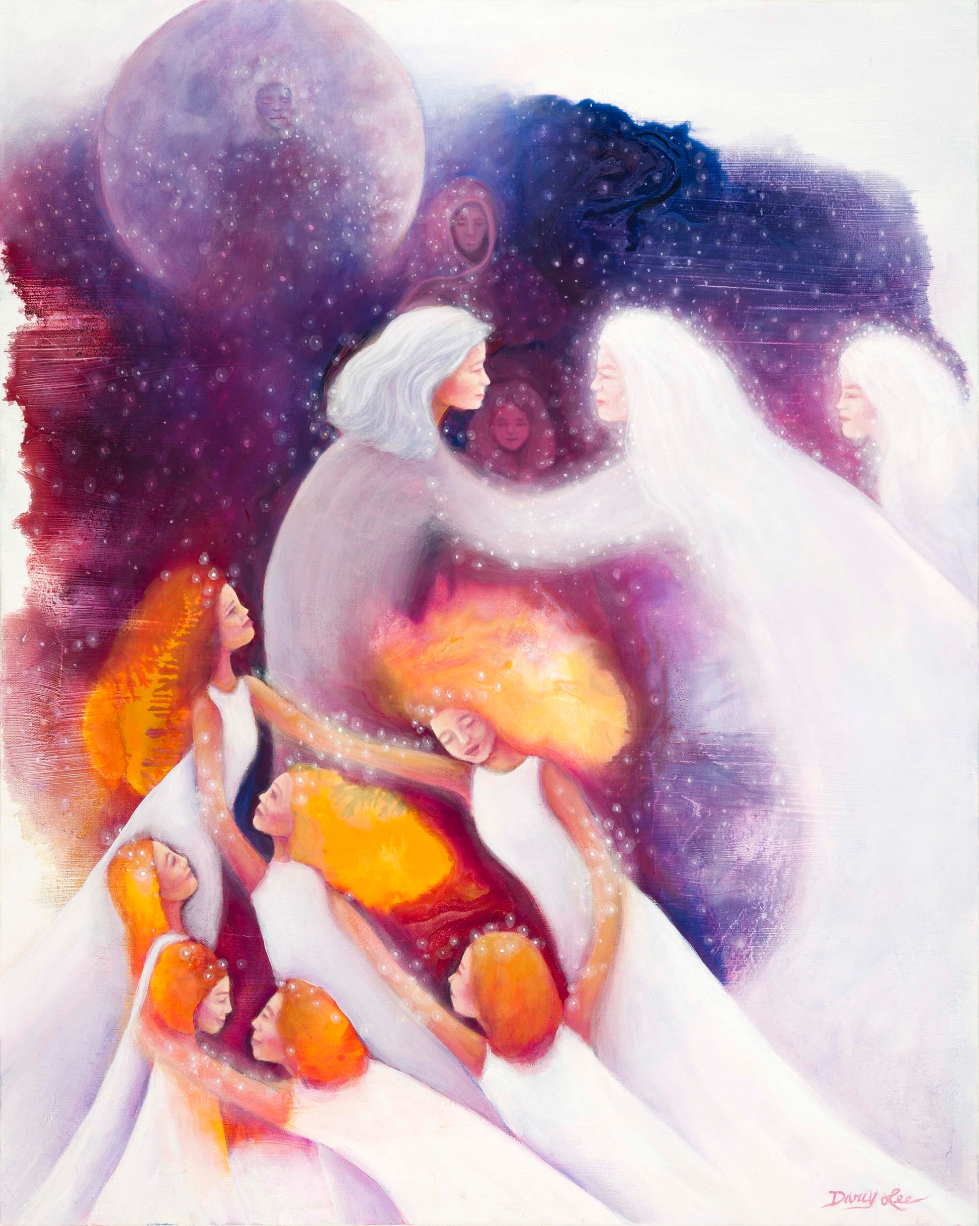Soft light and flowing movement weave generations together, from elders to children, from memory to becoming. Warm gold and orange radiate vitality and life force, while violet and deep rose convey wisdom, compassion, and spiritual depth. Inheritance invites reflection on what is passed down beyond words, the gifts of courage, strength, and truth.