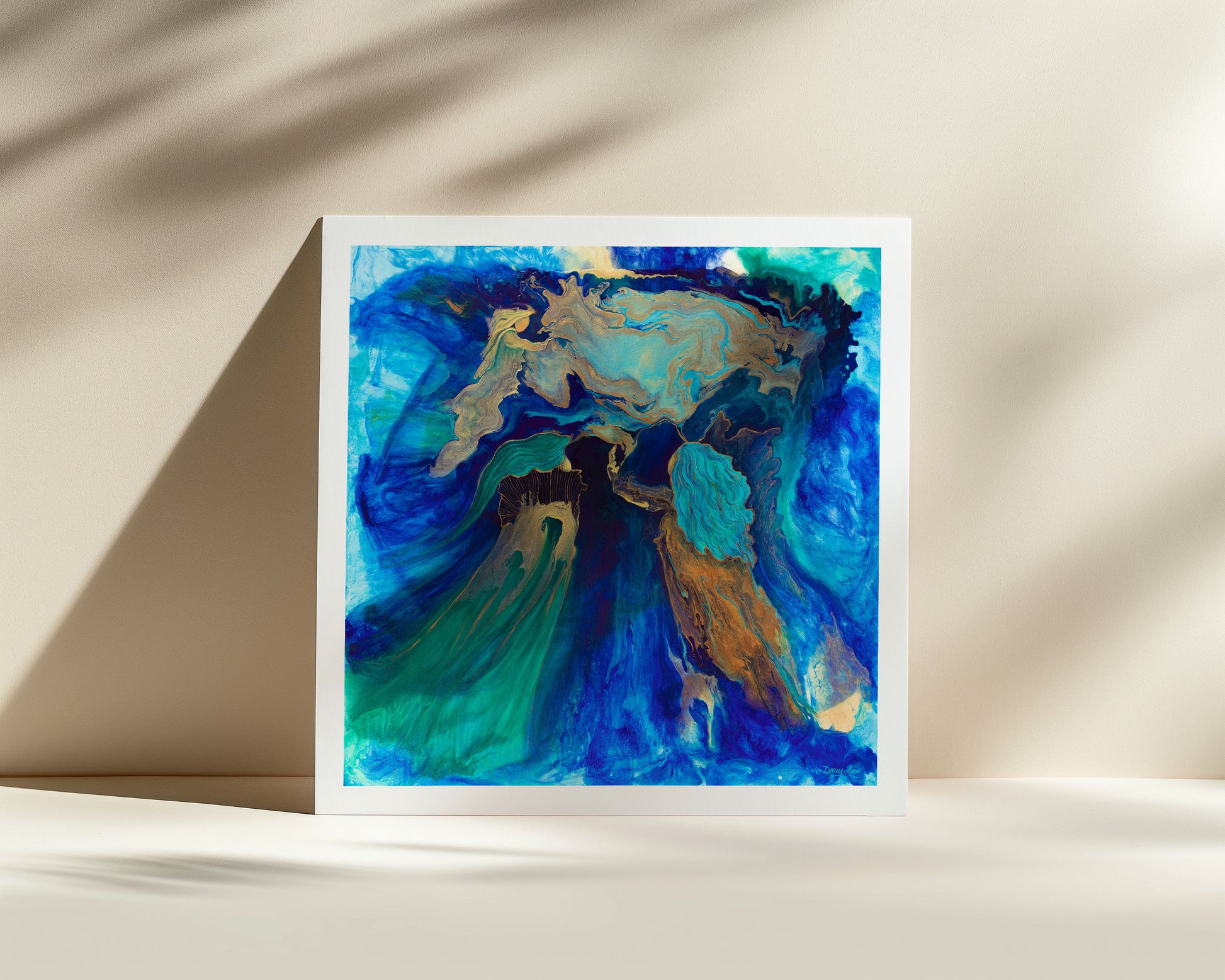 Blues carry the energy of trust, authenticity, and emotional depth, inviting a return to inner truth and sacred listening. Golds and bronzes ground the composition with divine presence and ancestral strength. Turquoise and green bring renewal and the vibrant energy of emergence. Together, these tones echo the rhythm of becoming and the fertile mystery of creation itself.