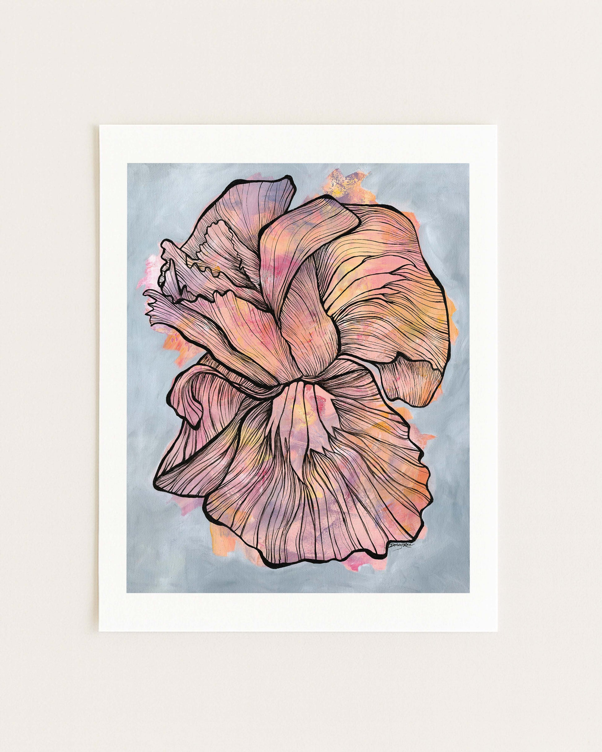 This piece magnifies the folds and curves of a flower, transforming its delicate petals into an intricate map of line and form. The layered washes of color create a soft luminosity, as if the petals are holding light within them.