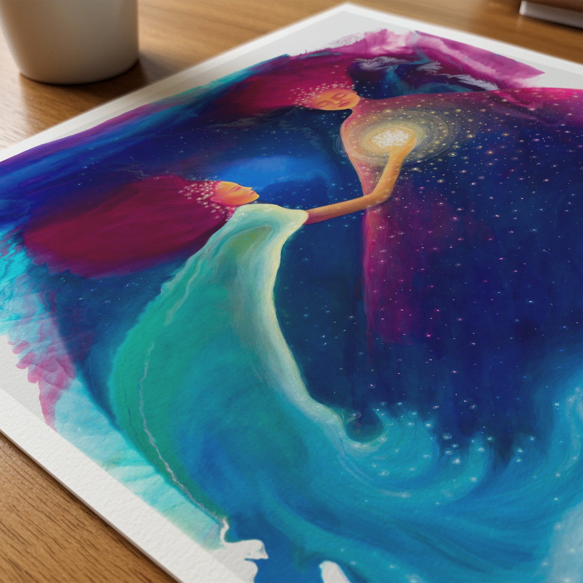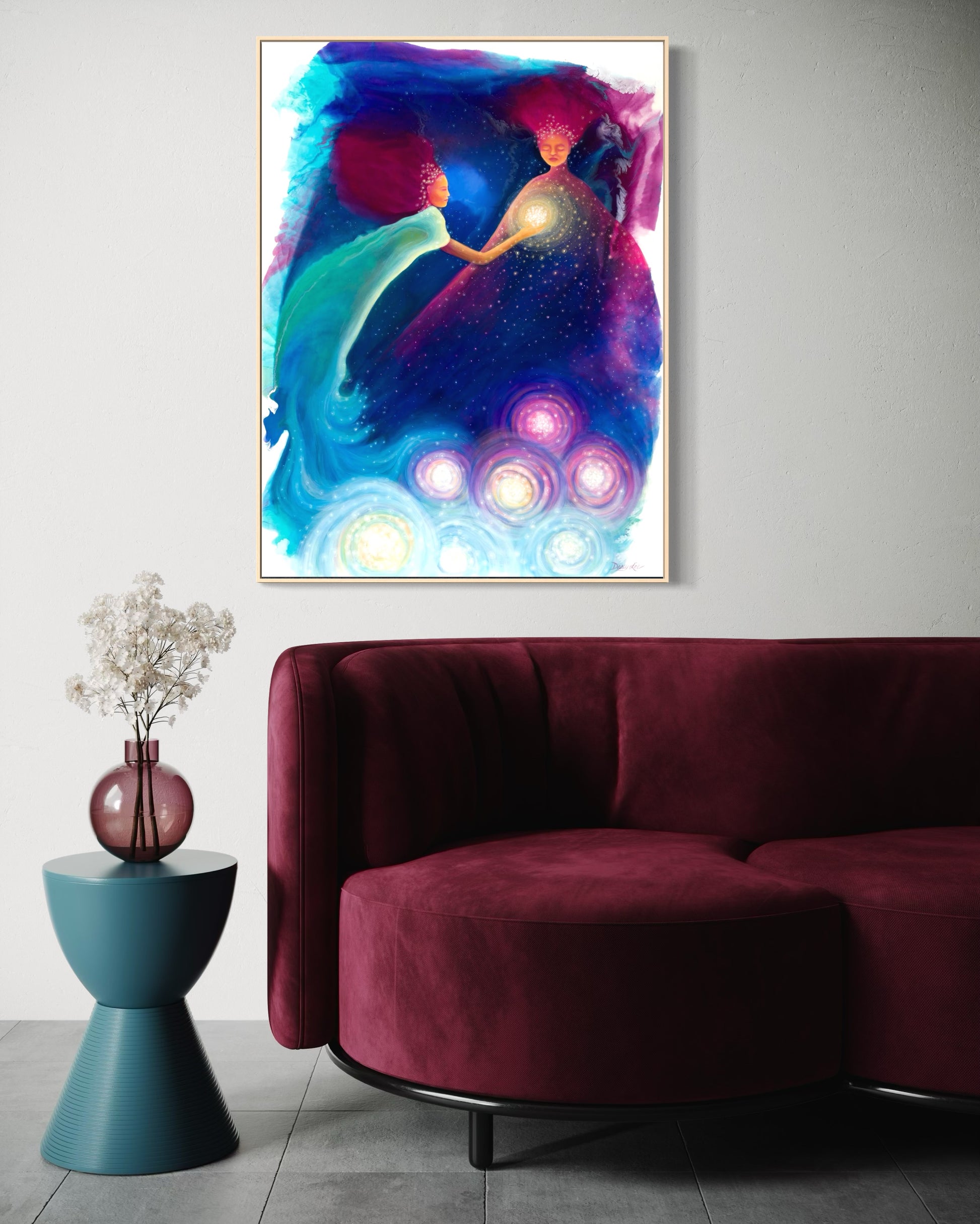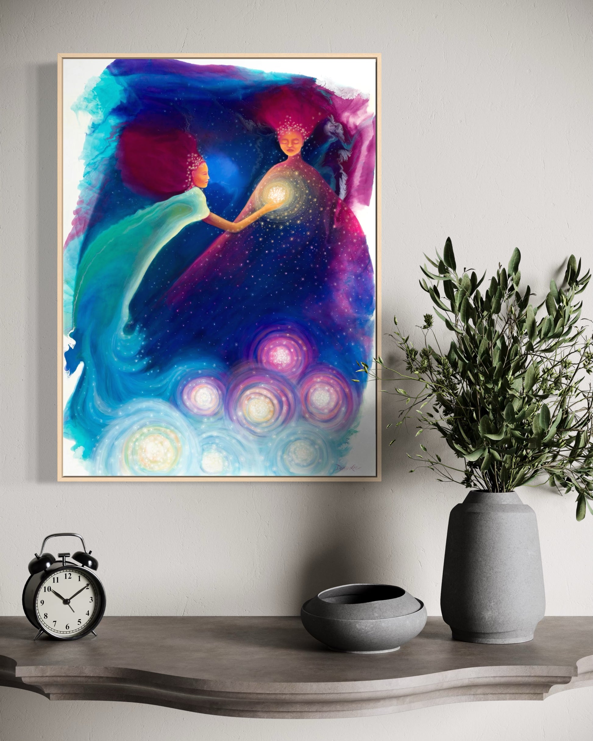 Alive with celestial color energy, it emanates compassion, trust, and transformation. This painting invites you to open your palms, release what no longer serves, and give freely from the infinite source within.