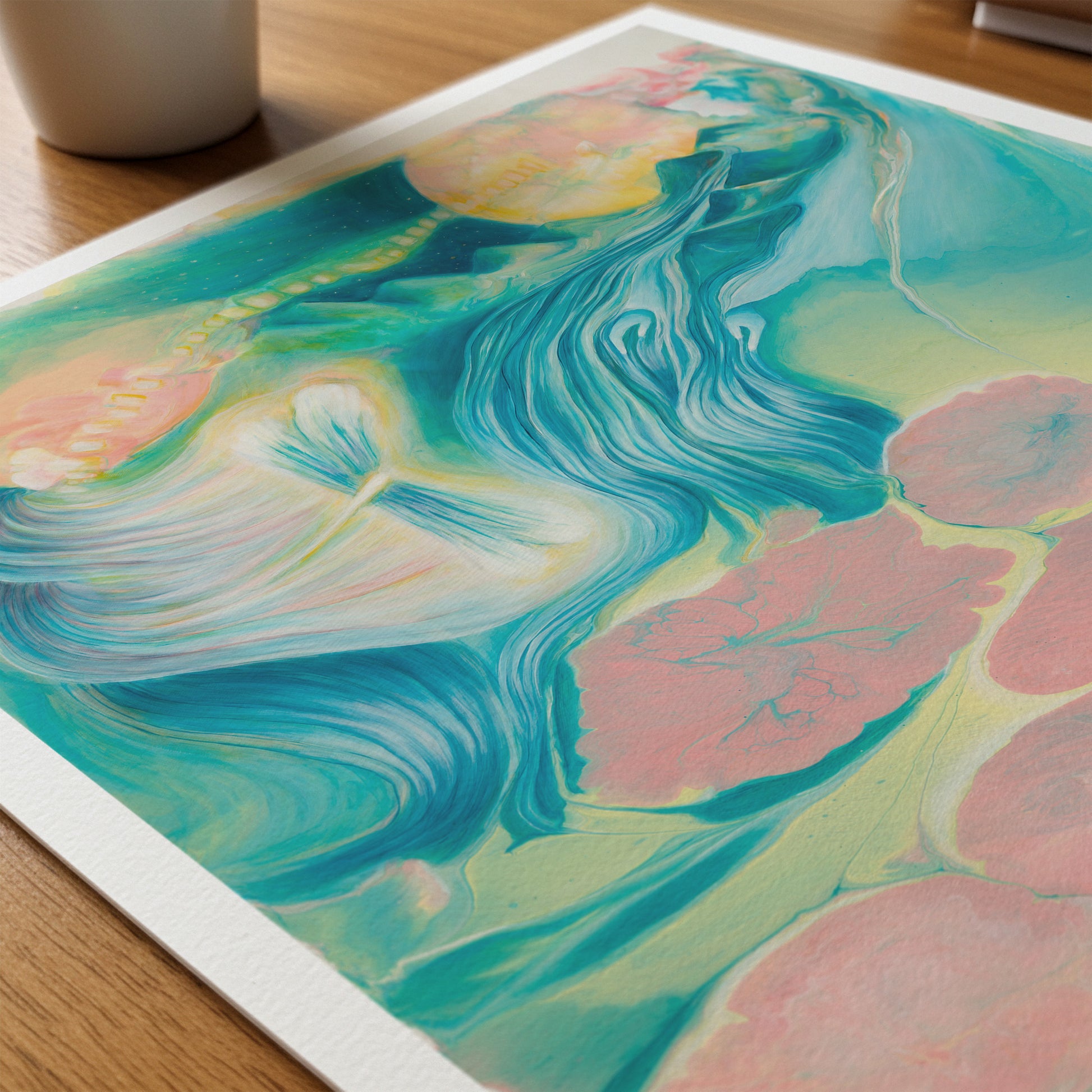 Soft, harmonious tones of teal, sea green, and golden yellow move across the canvas in gentle rhythm. These colors carry the energies of emotional healing, intuitive wisdom, and spiritual illumination. Soft pinks open the heart space, inviting compassion and tenderness, while fluid movement and layered texture evoke cycles of breath, water, and becoming.