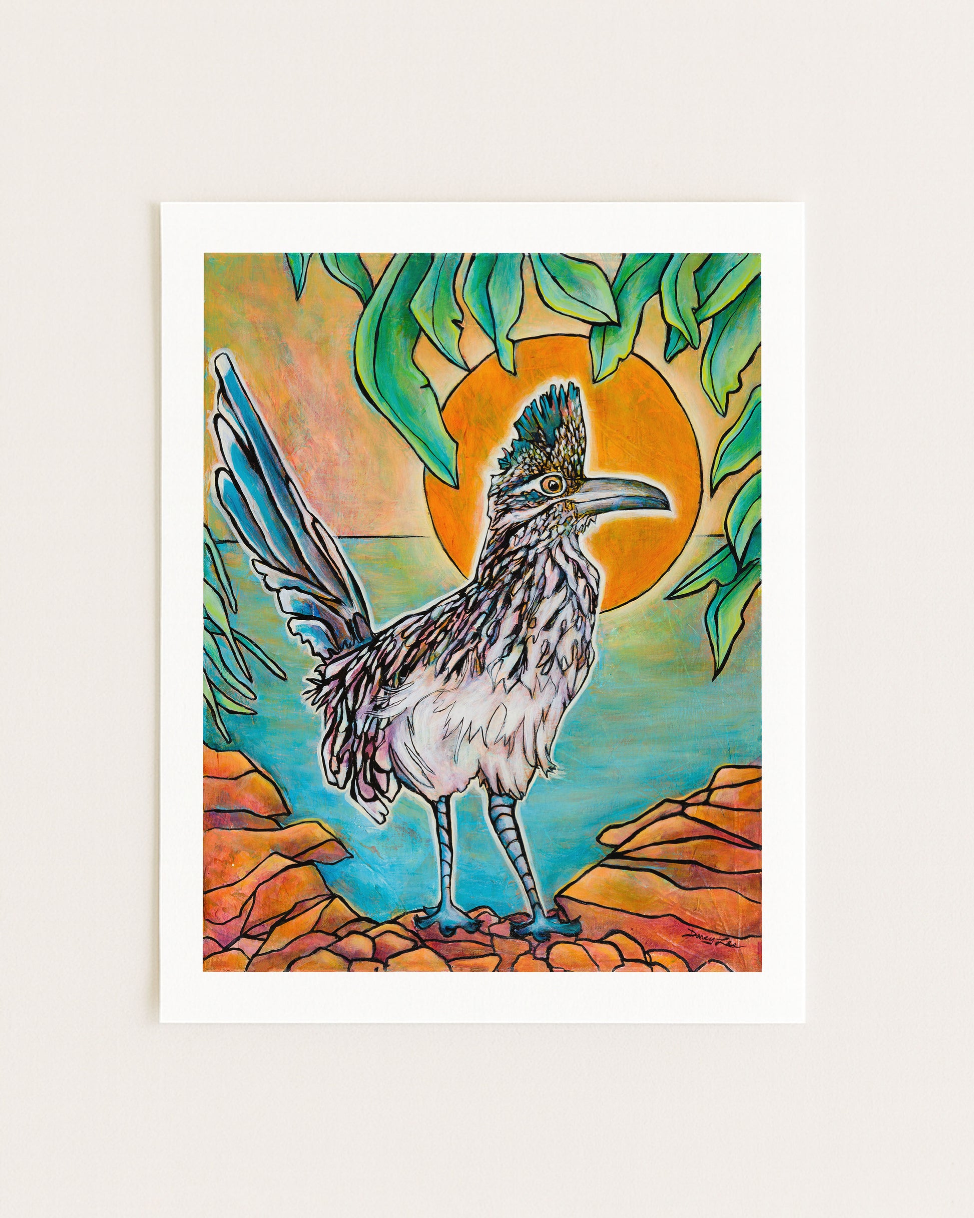 Set in the desert's glowing light, a roadrunner stands alert and alive, an emblem of resilience and sacred pace. The golden sun rises behind its feathered crest, offering warmth and quiet illumination. Surrounded by flowing leaves and red rock, this painting captures a moment of grounded aliveness in the midst of solitude.