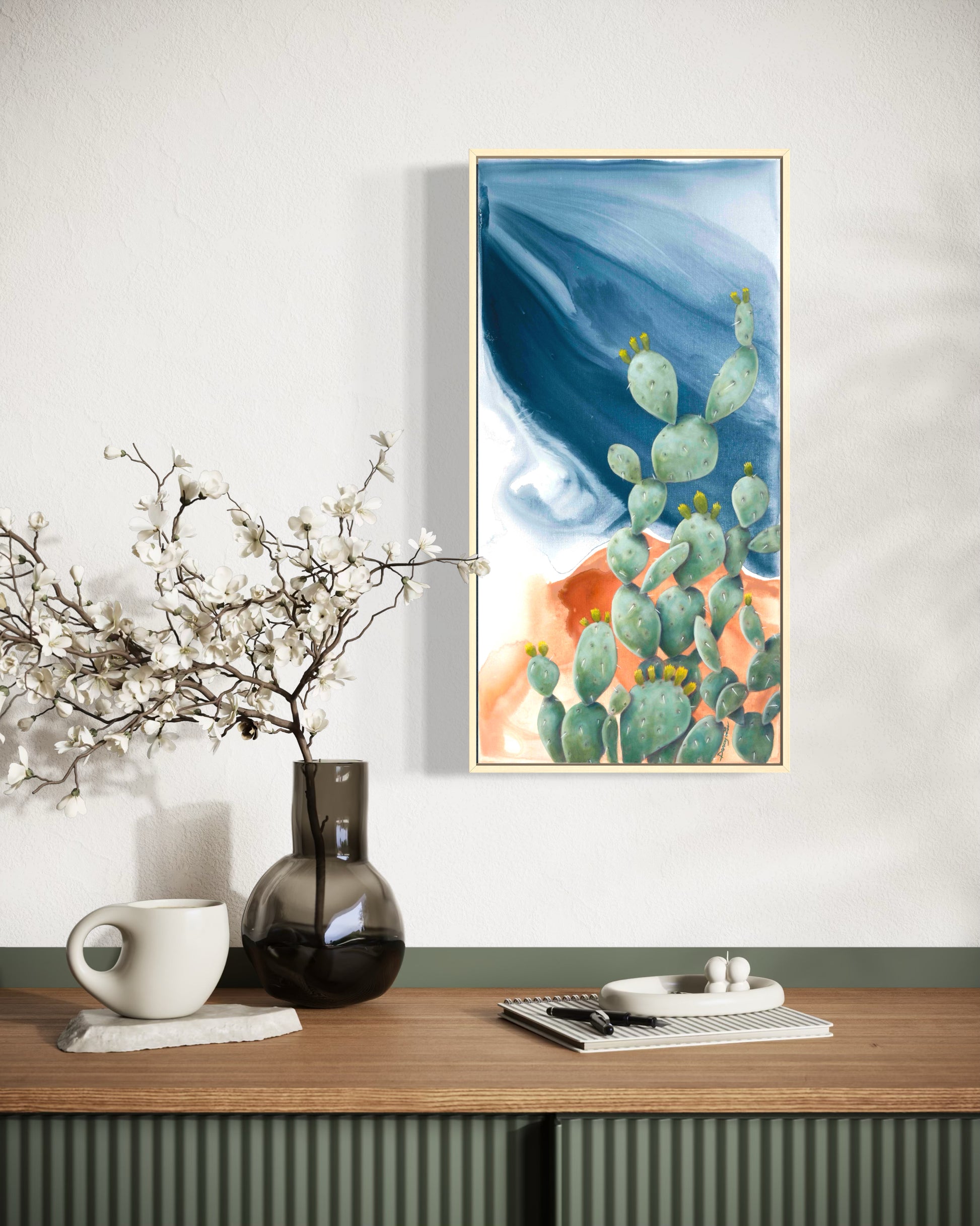 RESOLUTE – A 15×30-inch acrylic on canvas celebrating the courage to face our inner desert. On the surface it’s a cactus braving a storm. More deeply, it is about choosing to adapt and thrive; about withstanding droughts and storms, weathering inner expanses, and standing tall through every season.