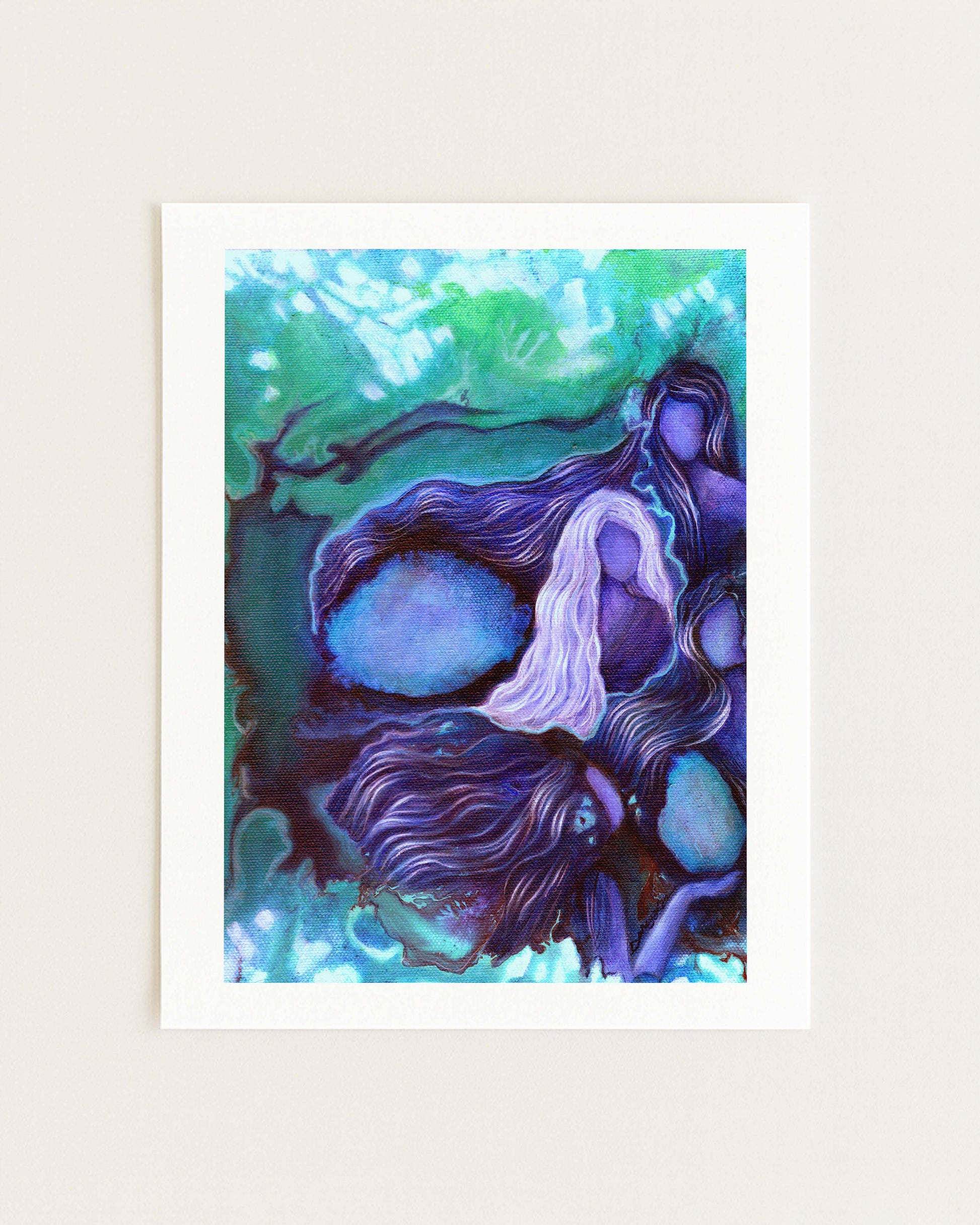 Emerging through poured layers of paint, the feminine figures in Seeking surfaced intuitively, revealing themselves gradually through color and form. Teal and blue hues bring a calm, confident energy, while the fluid shapes echo the layered nature of spiritual growth. The softness of the palette contrasts with the power of presence held in each form.