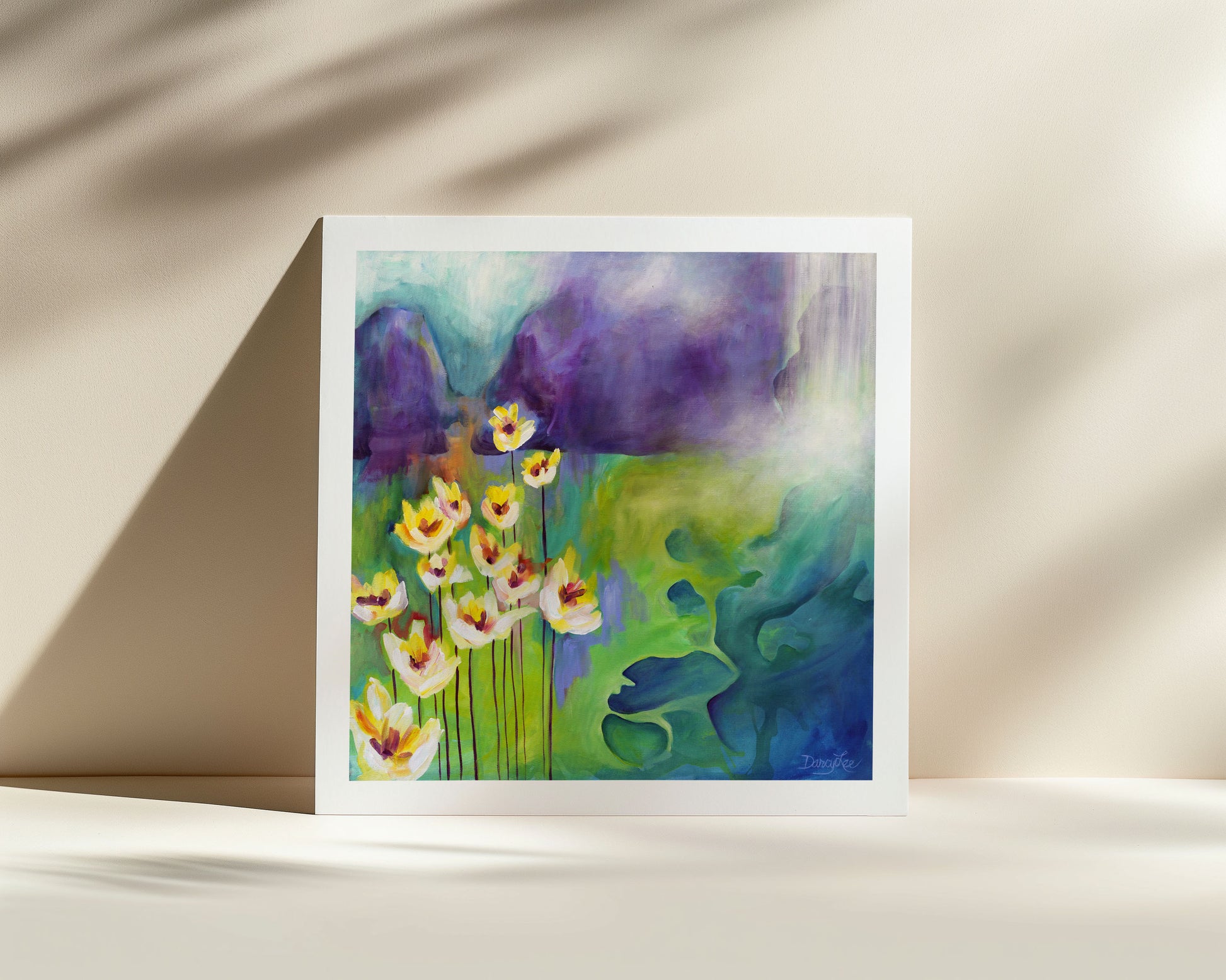 Brushstrokes reach upward like seedlings toward the sun, with abstract blooms rising from rich, unseen soil. Vibrant greens evoke renewal, growth, and the wisdom of nature. Yellows radiate optimism, vitality, and light. Soft purples bring a sense of intuition and emotional depth. Together, these colors create an atmosphere of hope, quiet courage, and fertile potential.