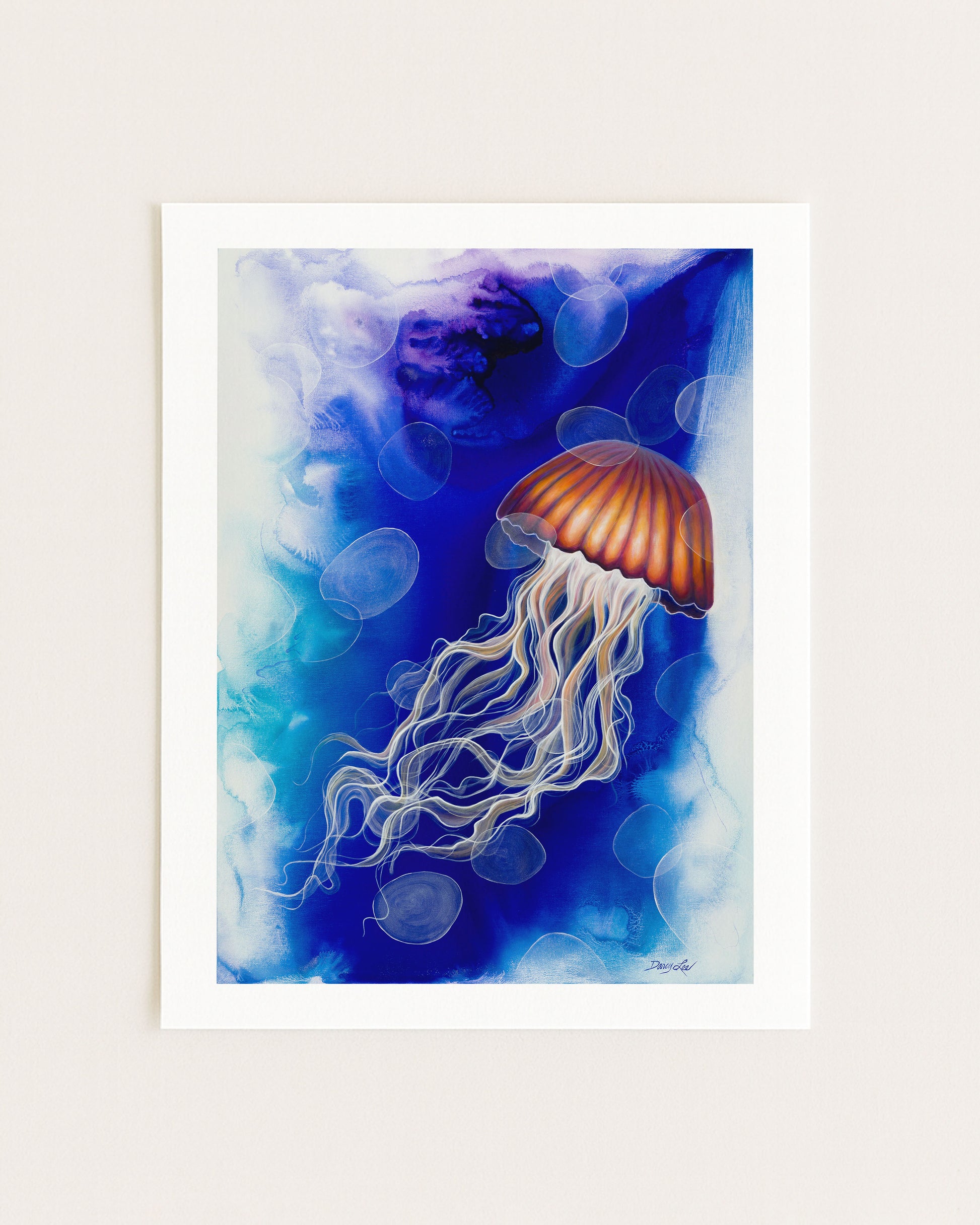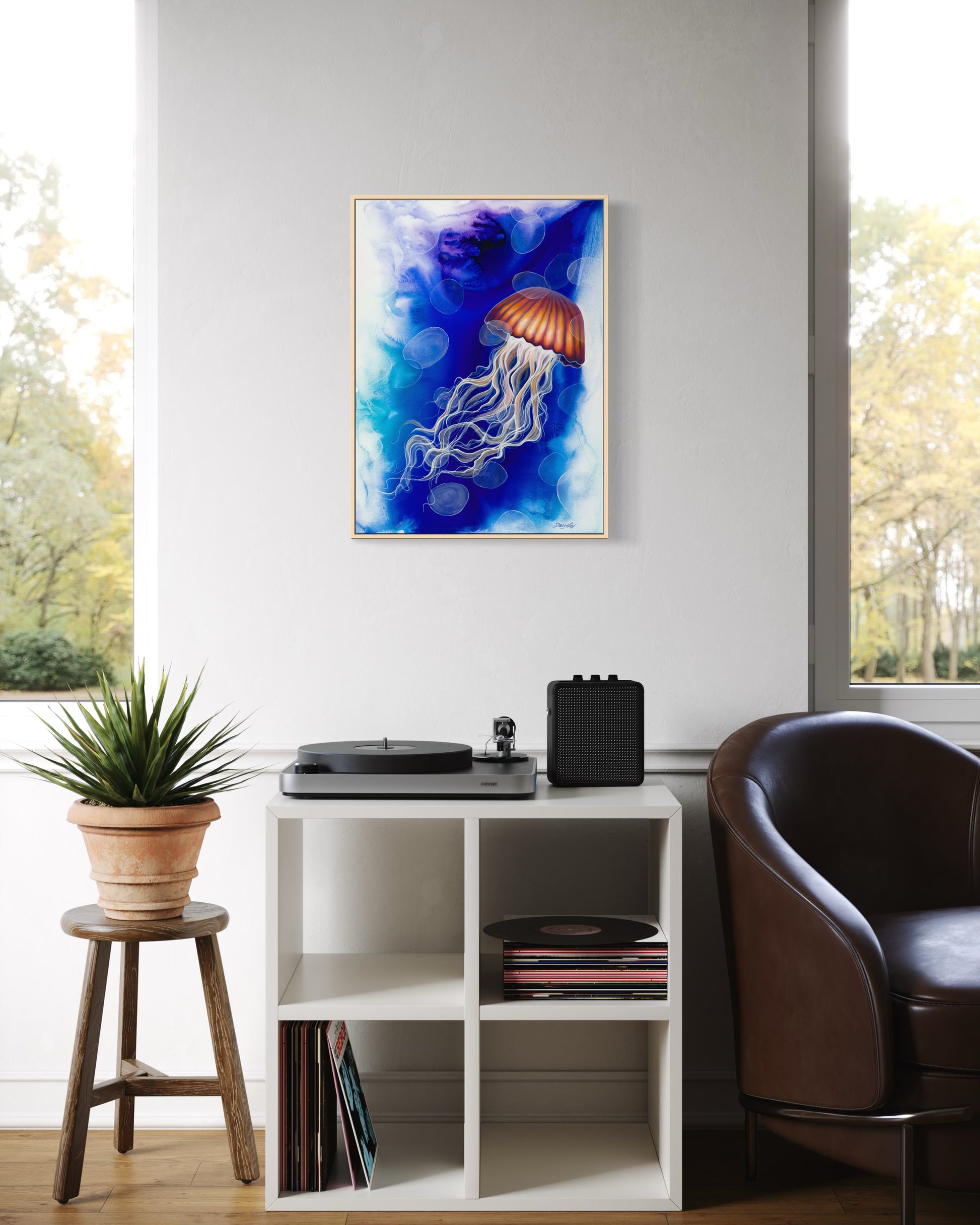 SUBLIMITY – A luminous 30×40-inch acrylic on canvas inspired by the quiet wonder of observing a jellyfish, one of nature’s most glorious and mesmerizing creatures. This piece tells the story of that moment and holds the energy of surrender, flexibility, openness, and peace.