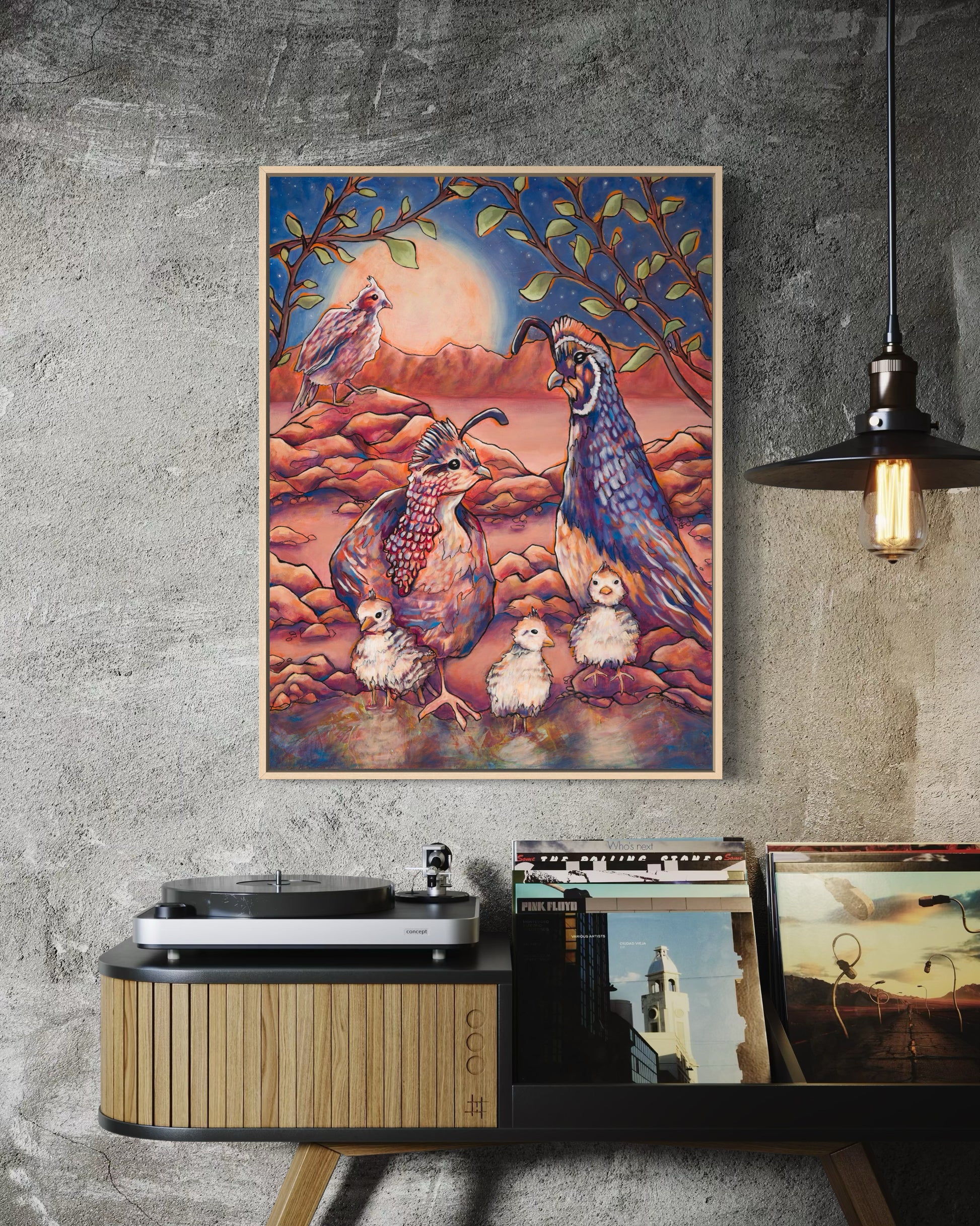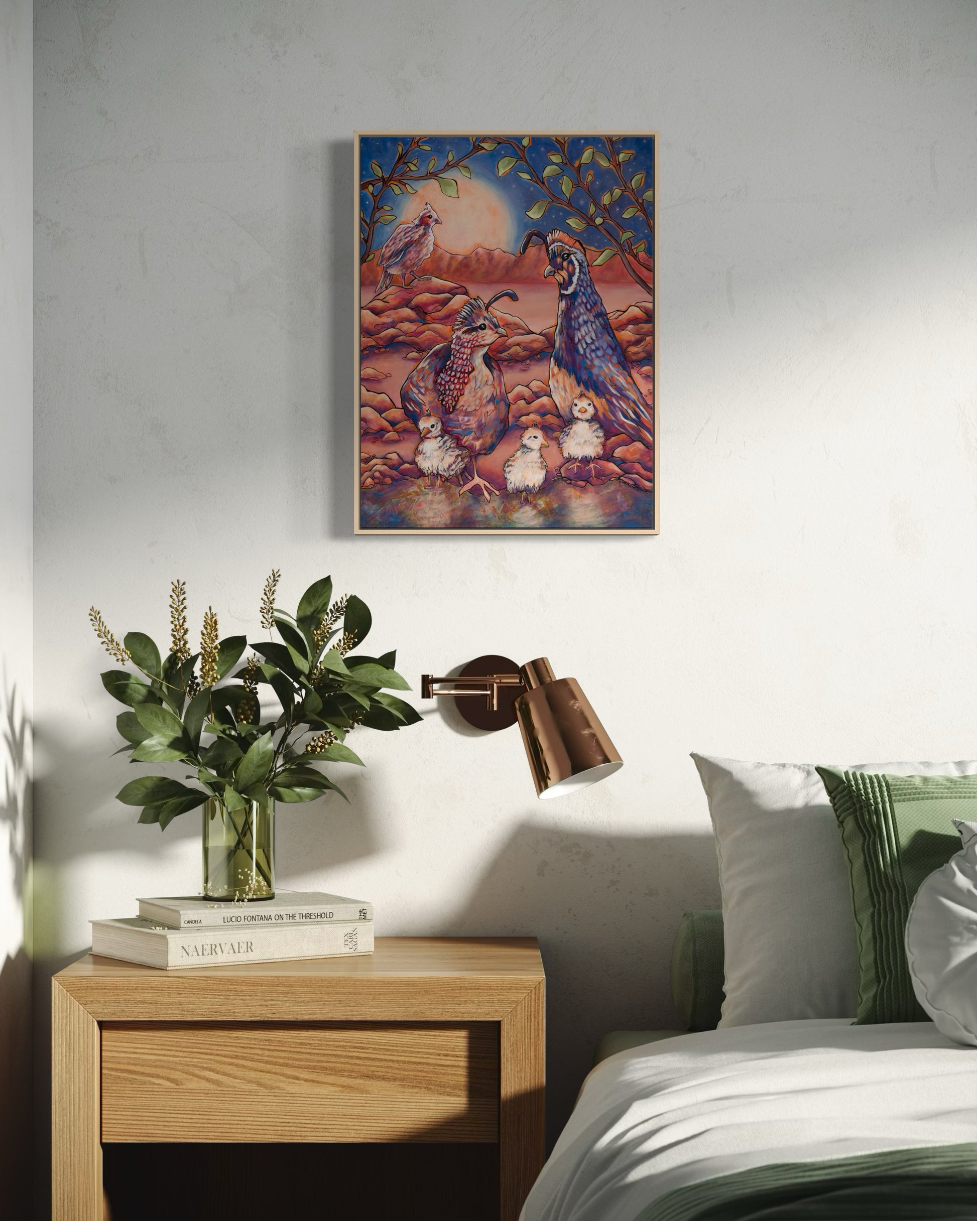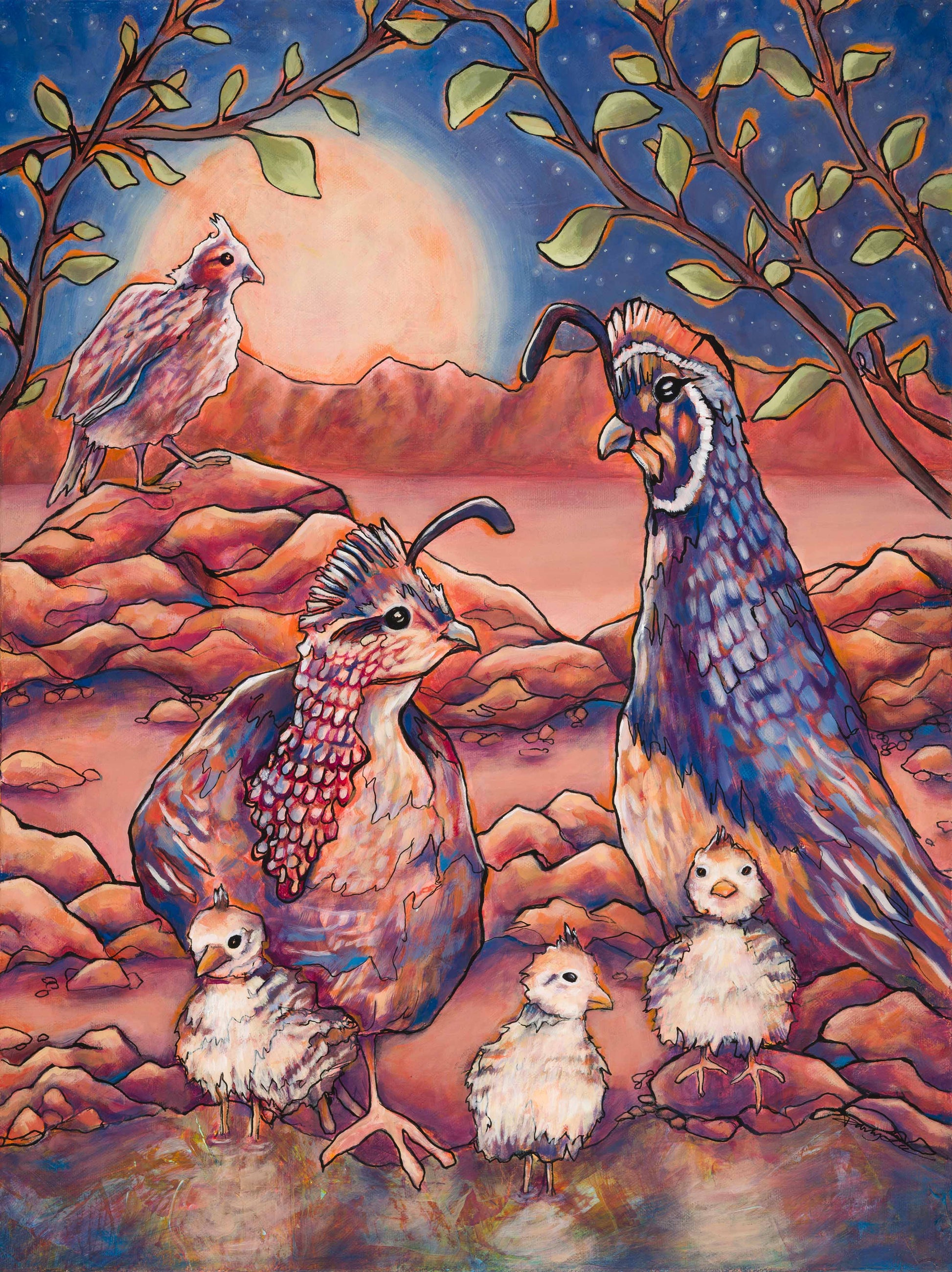 Set against the glowing stillness of twilight, this piece honors the gentle guardianship of parenthood and the quiet strength of togetherness. A family of quail gathers in warm earth tones, their forms nestled among red rocks and illuminated by the soft, rising moon. Above them, a star-dotted sky and arching branches cradle the scene with calm protection.
