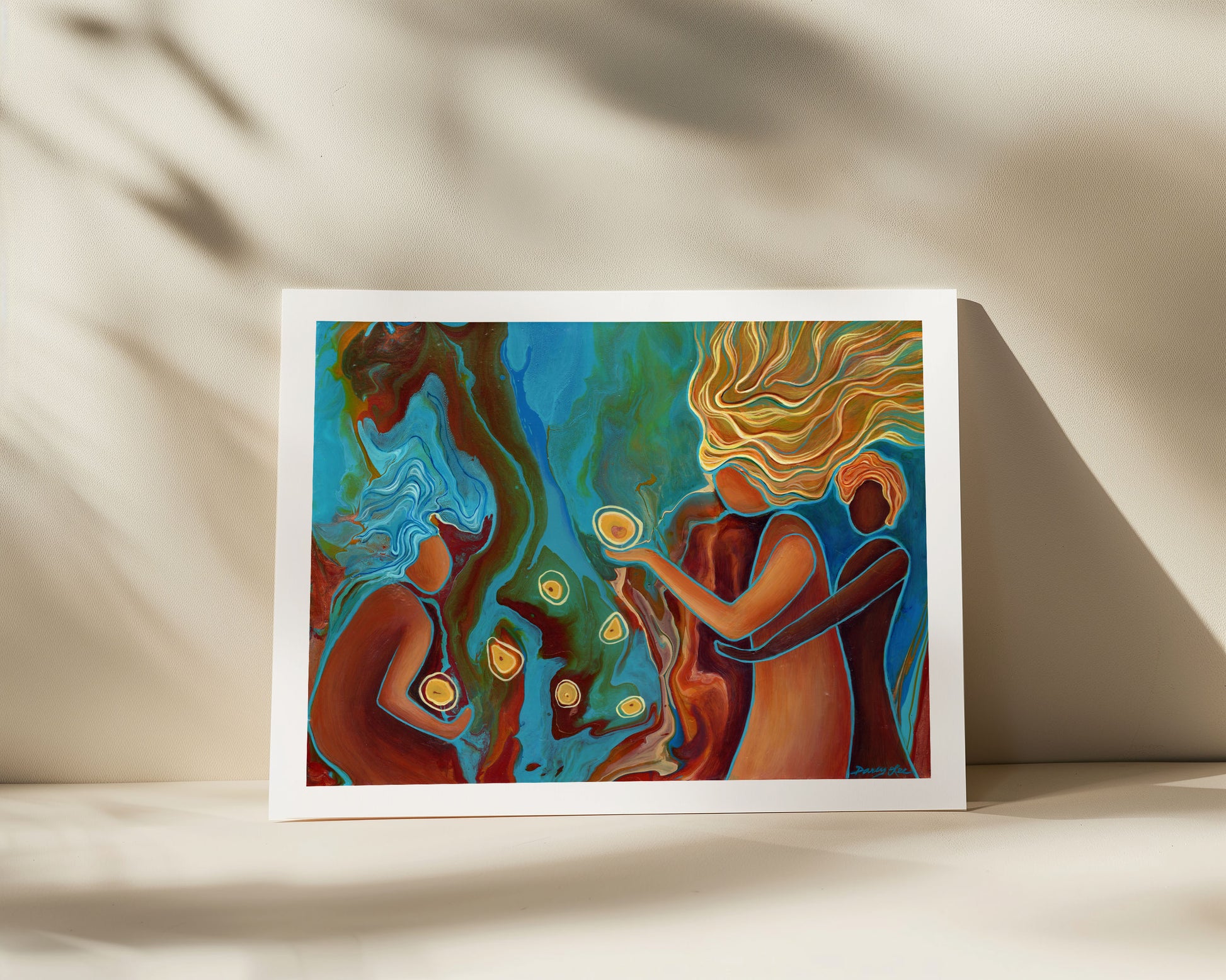 This piece speaks to the presence of those who came before us, the way their care and spirit continue to shape and guide us through time. Deep red evokes the strength and rootedness of feminine love. Earth tones ground the piece in continuity and memory. Ocean blues offer emotional depth and intuitive wisdom. Gold brings light and soul, symbolizing the gifts passed down beyond words or distance.